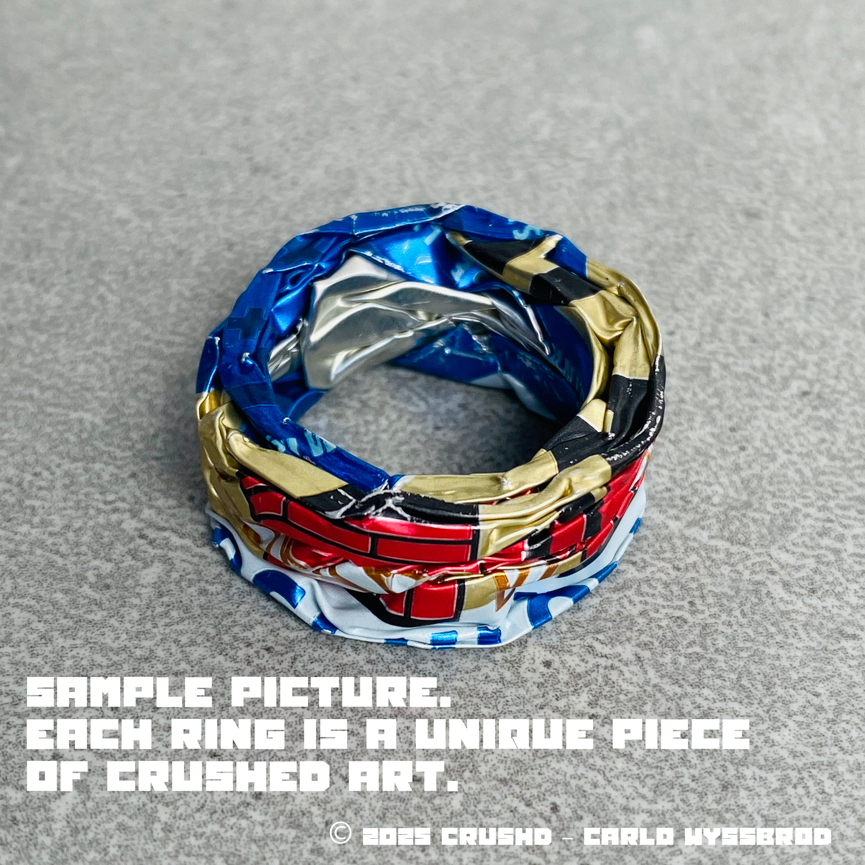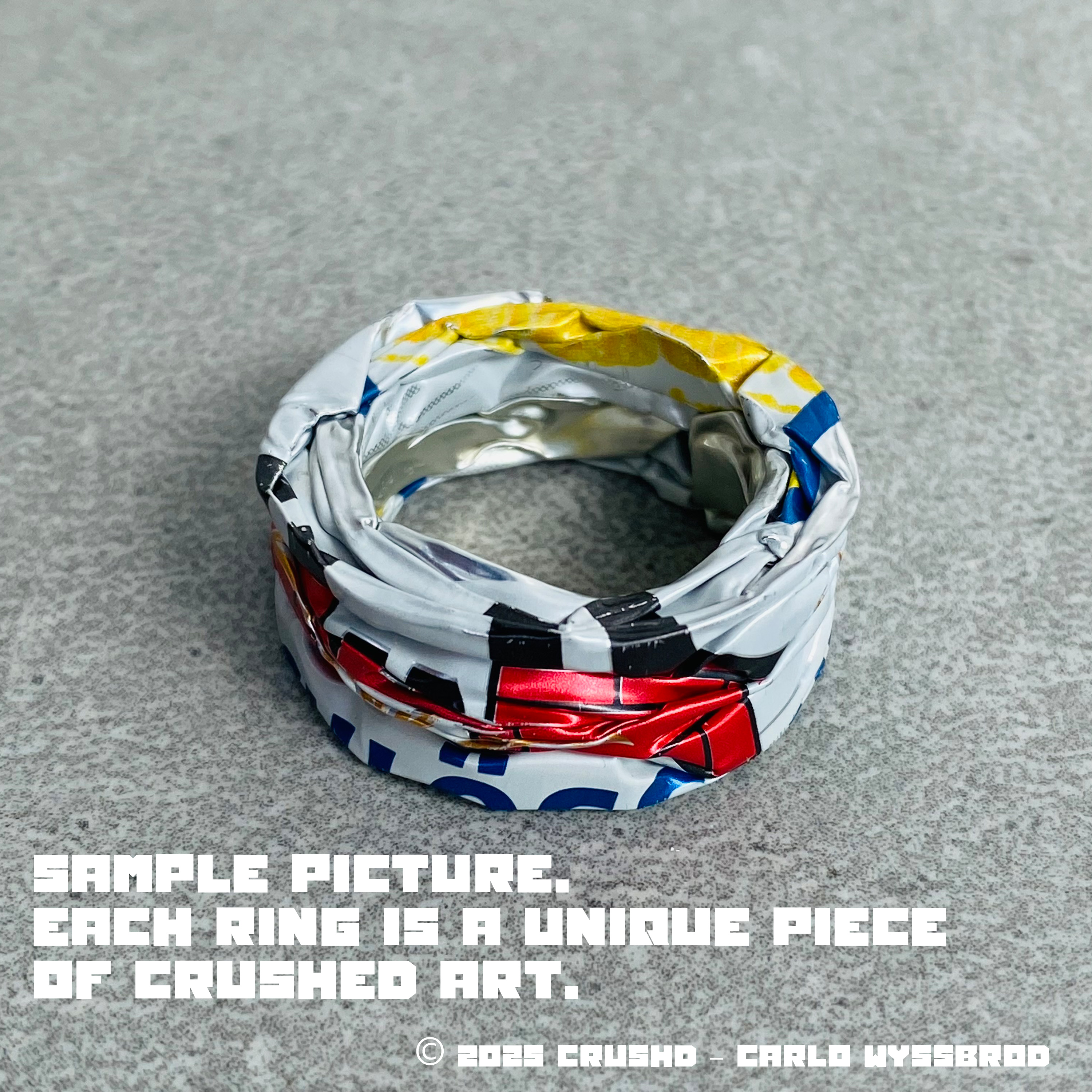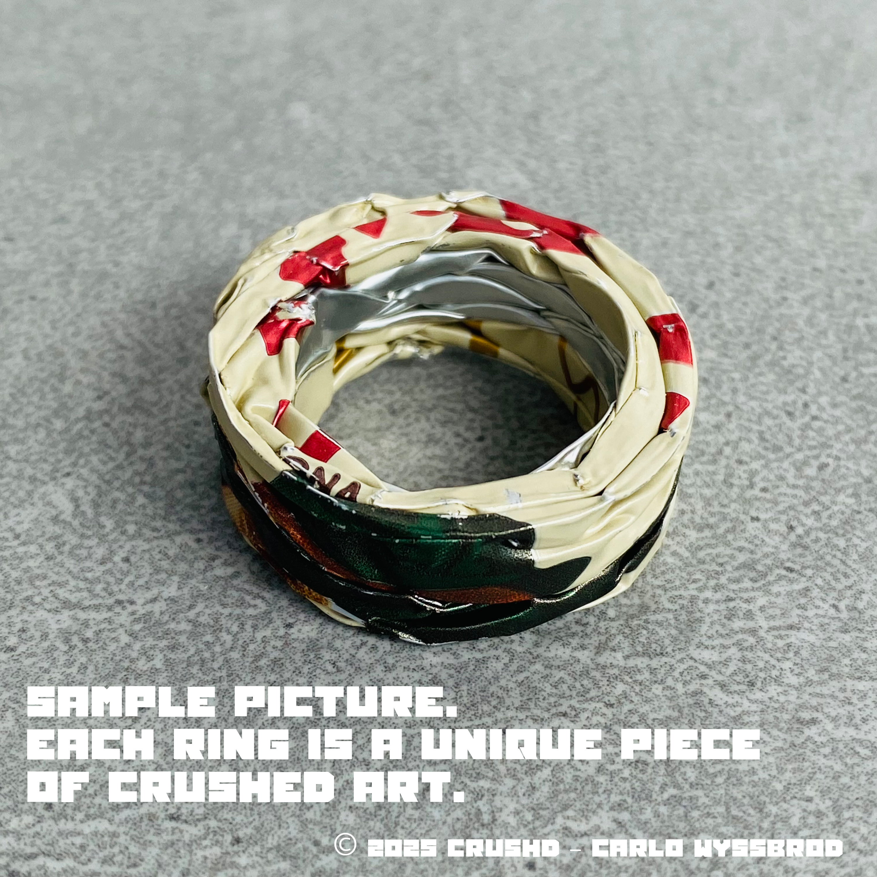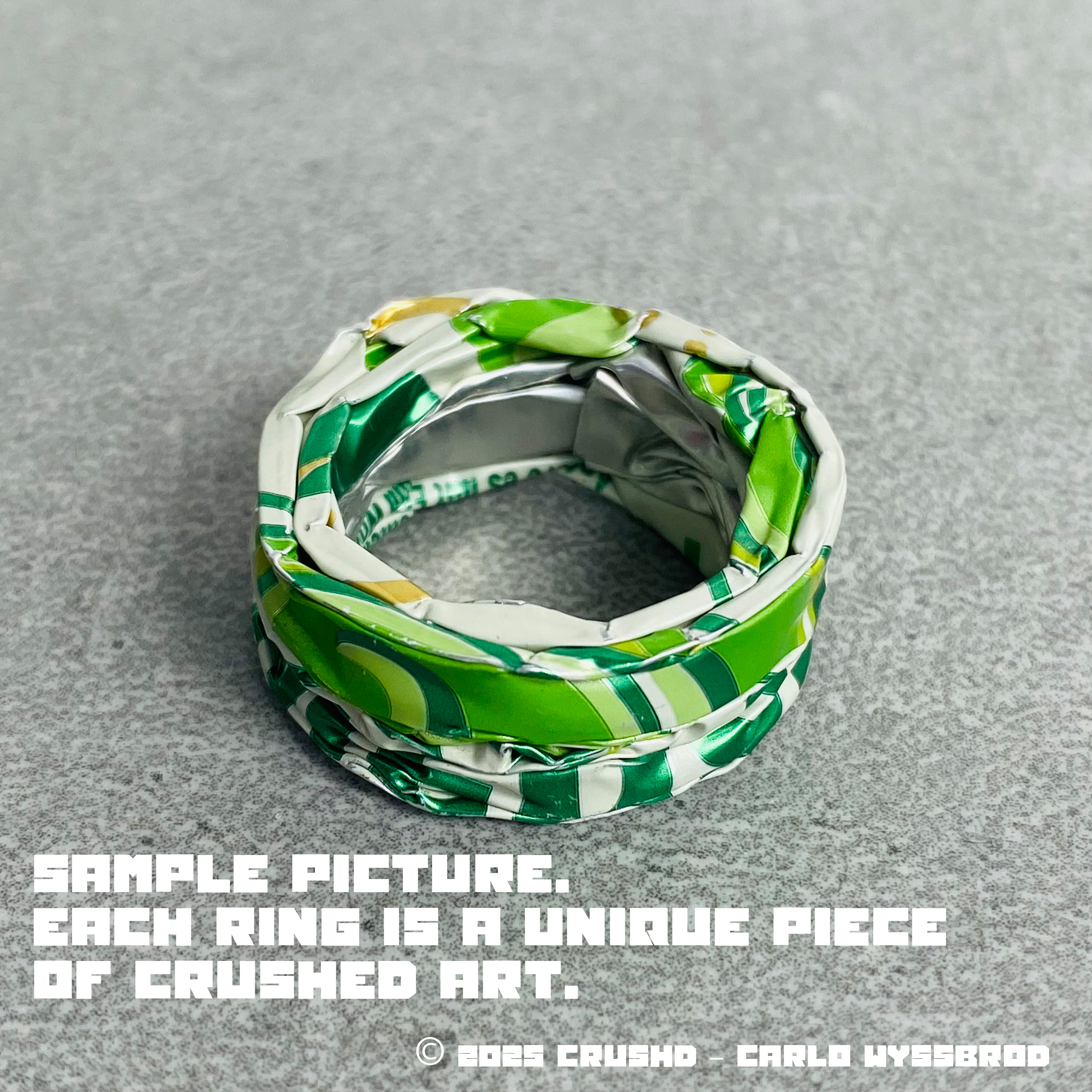 Each ring is pressed from raw, upcycled aluminum and left completely untouched — unpolished, unprocessed, and full of character. This preserves the authentic texture, unique imperfections, and vibrant identity of the original can.