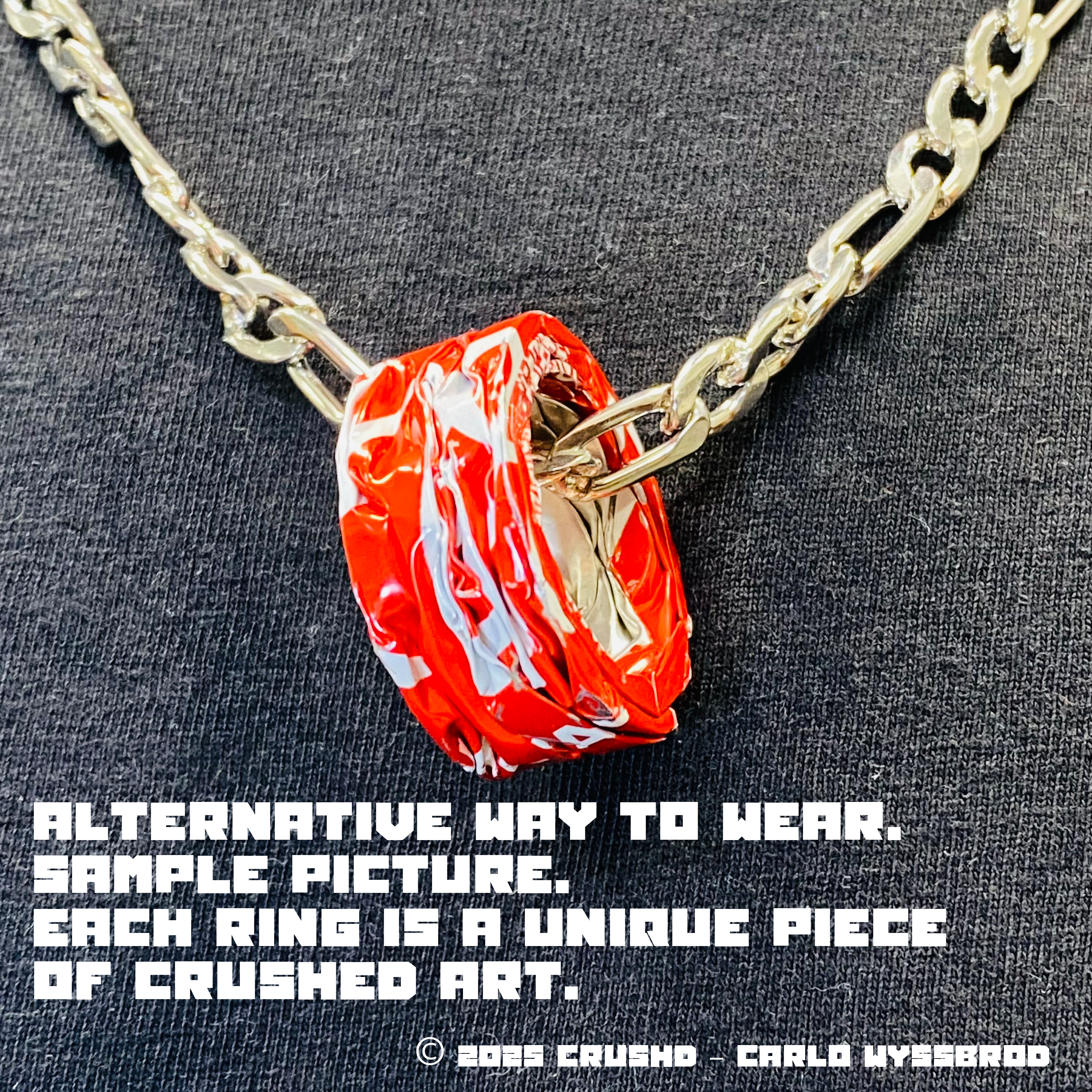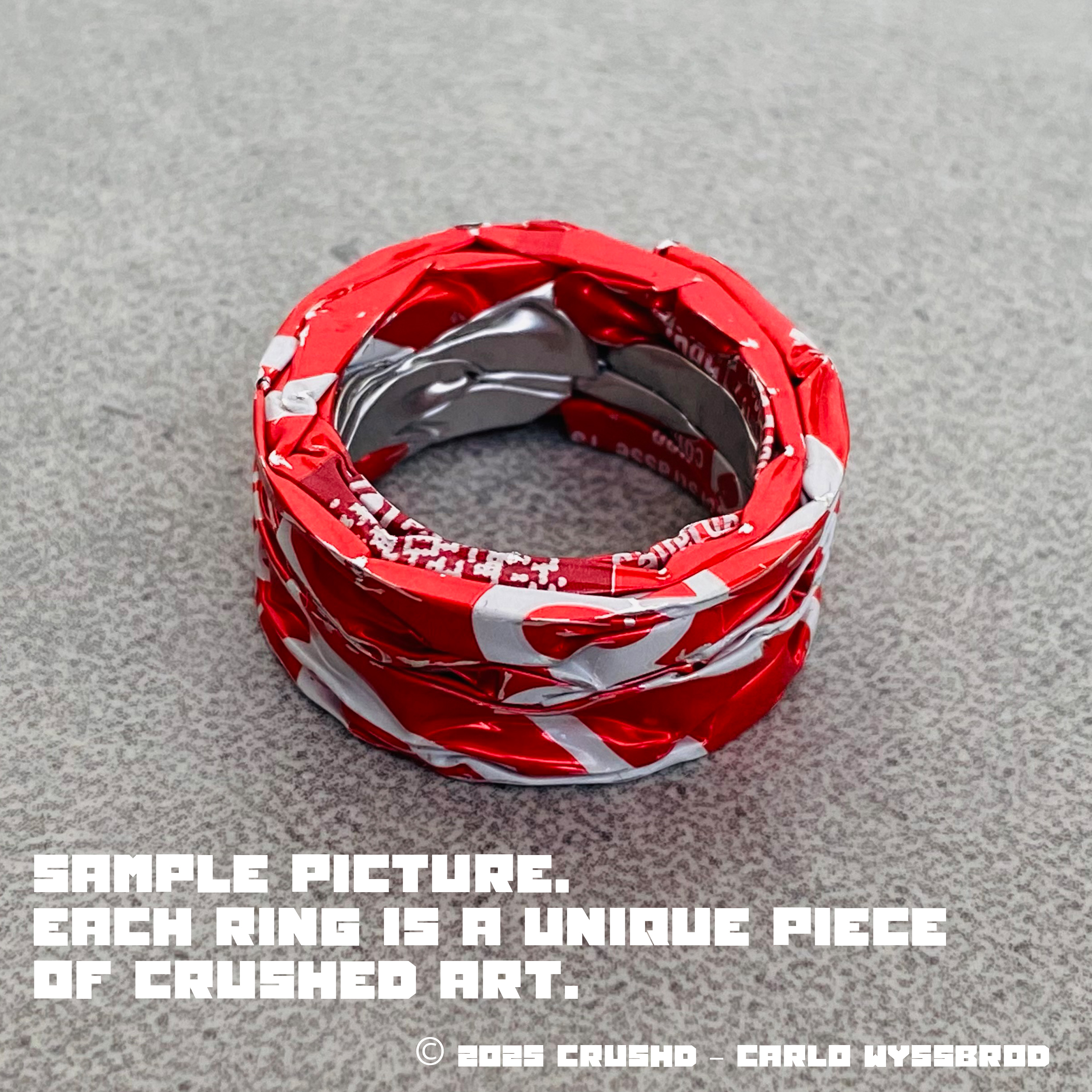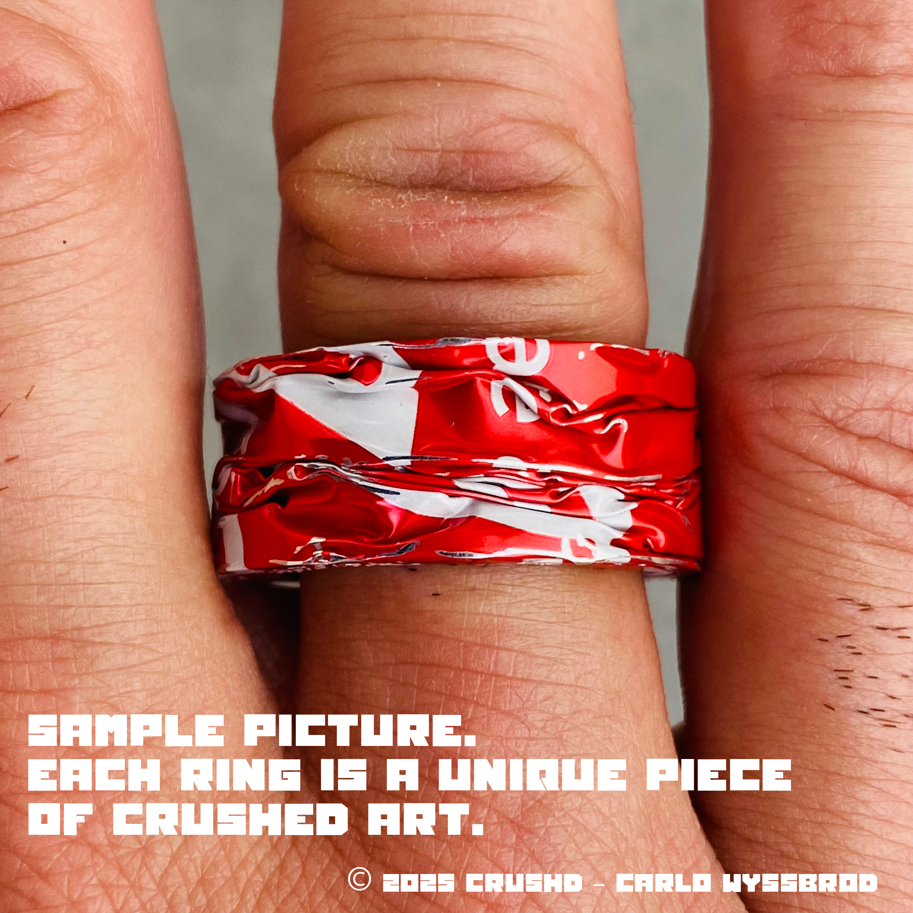 Each ring is pressed from raw, upcycled aluminum and left completely untouched — unpolished, unprocessed, and full of character. This preserves the authentic texture, unique imperfections, and vibrant identity of the original can.