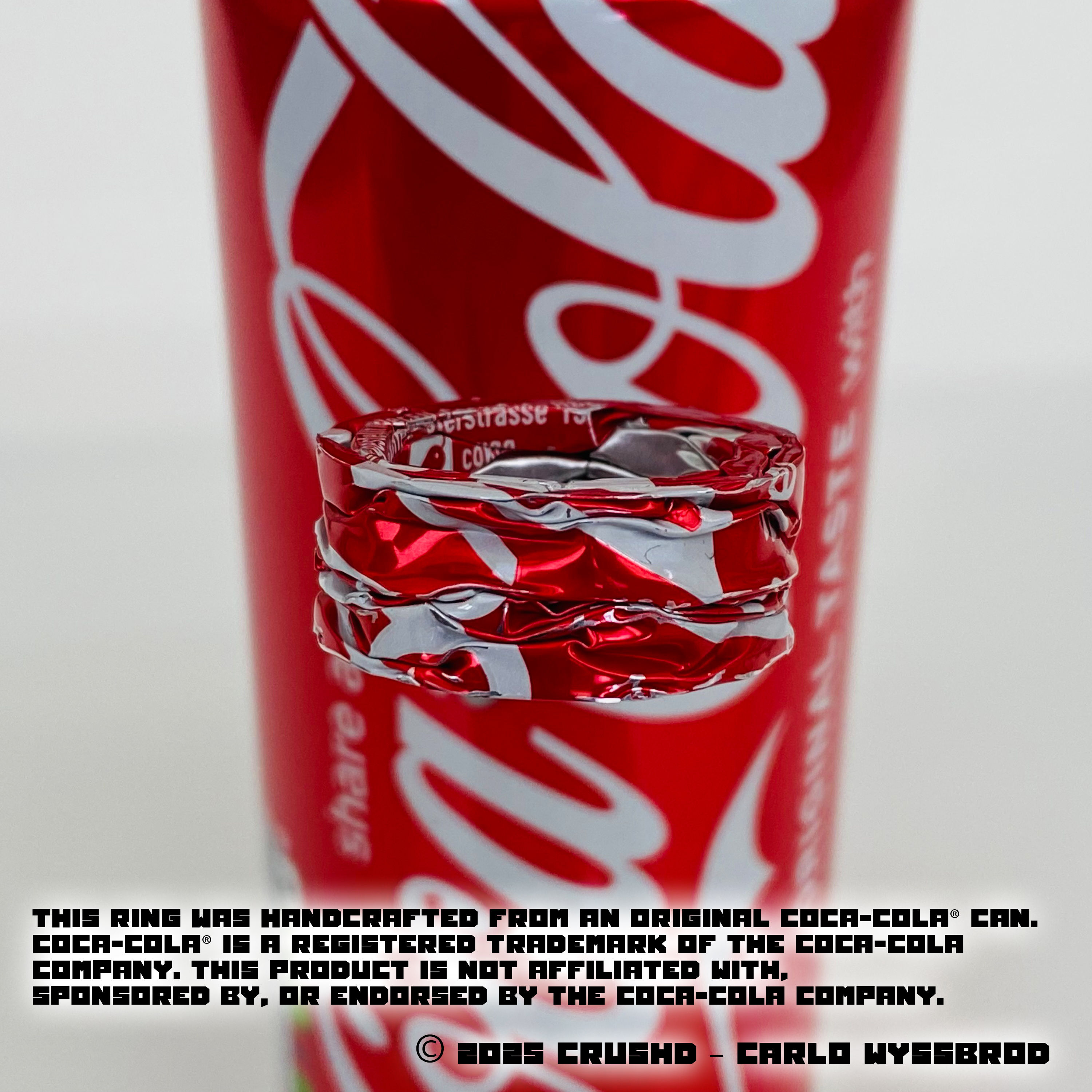 Note: This ring is made from an original Coca-Cola® can. Coca-Cola® is a registered trademark of The Coca-Cola Company. This product is not affiliated with, sponsored by, or endorsed by The Coca-Cola Company.