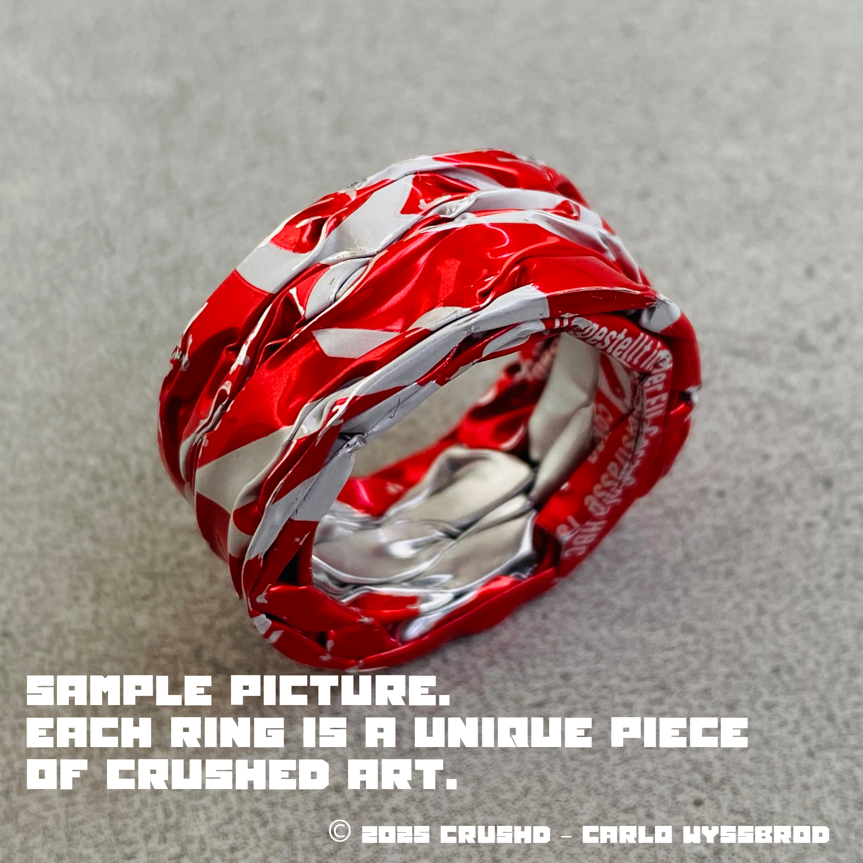 Handcrafted from an original Coca-Cola can, this ring channels the bold, timeless energy of a global icon. Each piece is individually crushed by hand into a one-of-a-kind piece of wearable art.