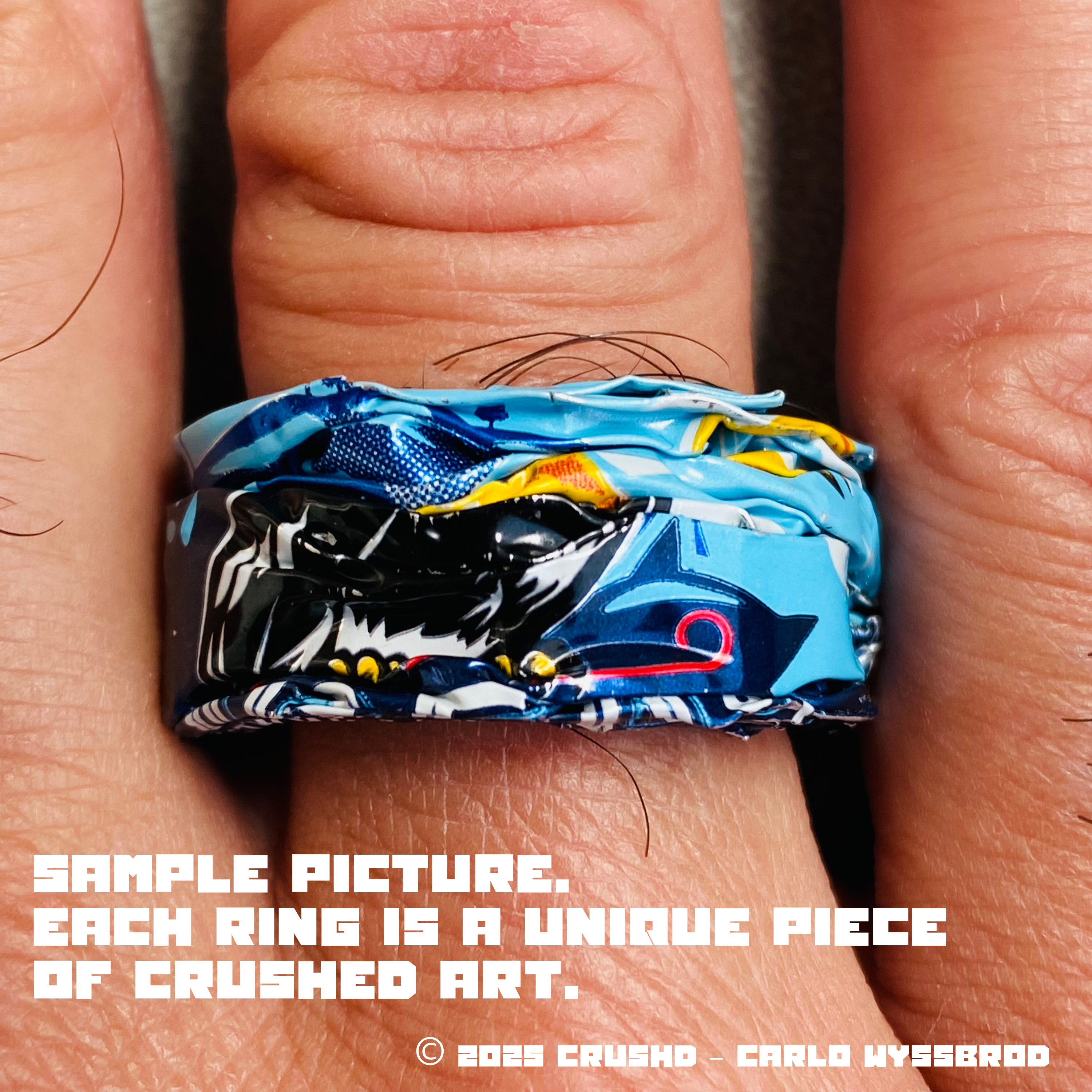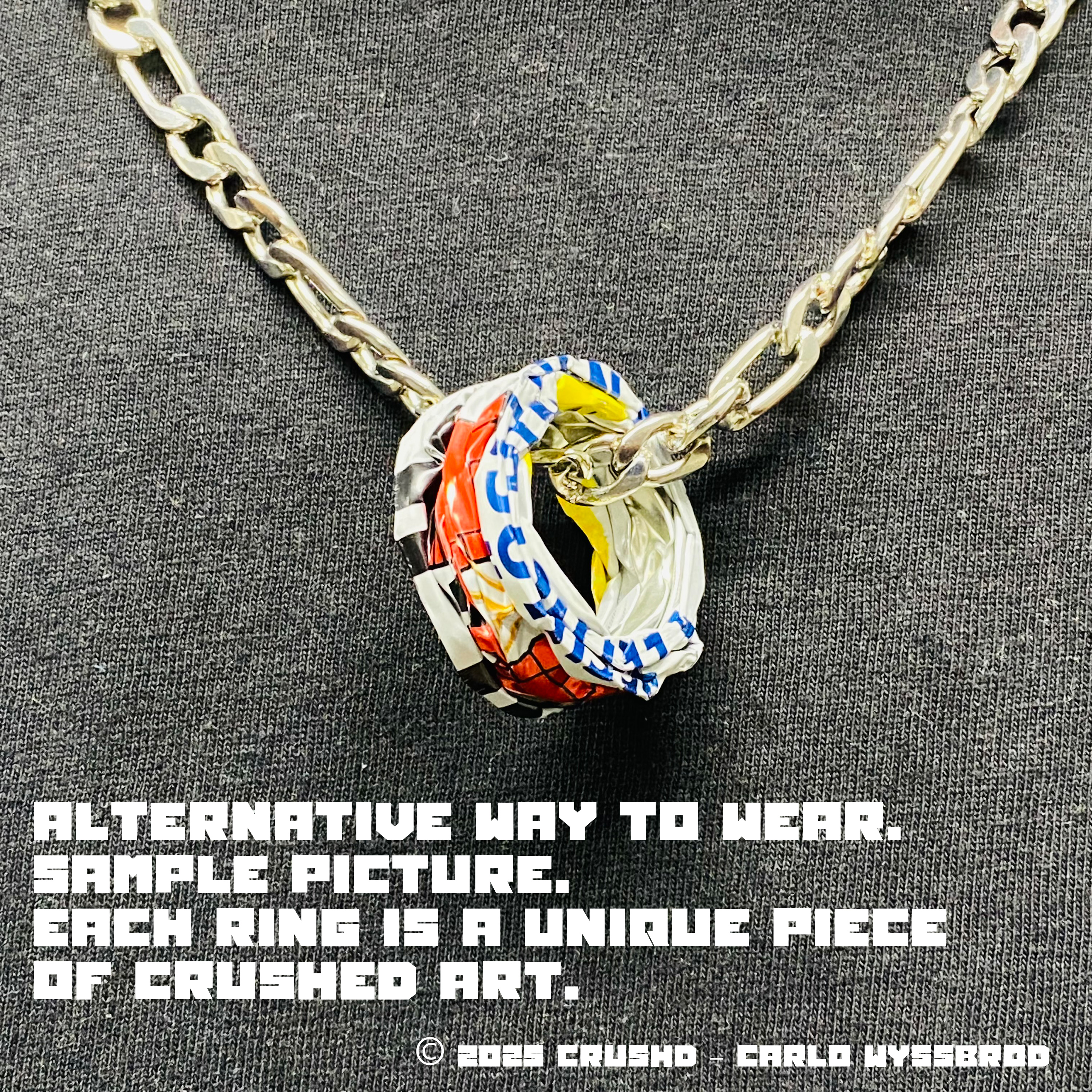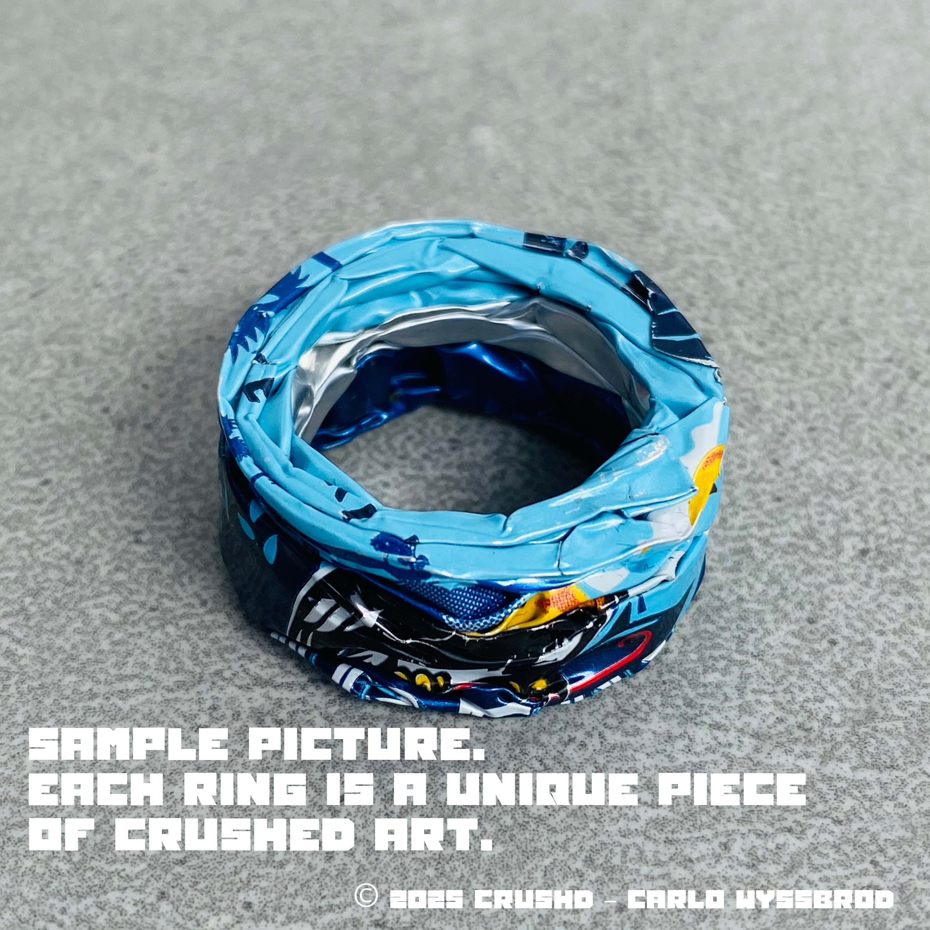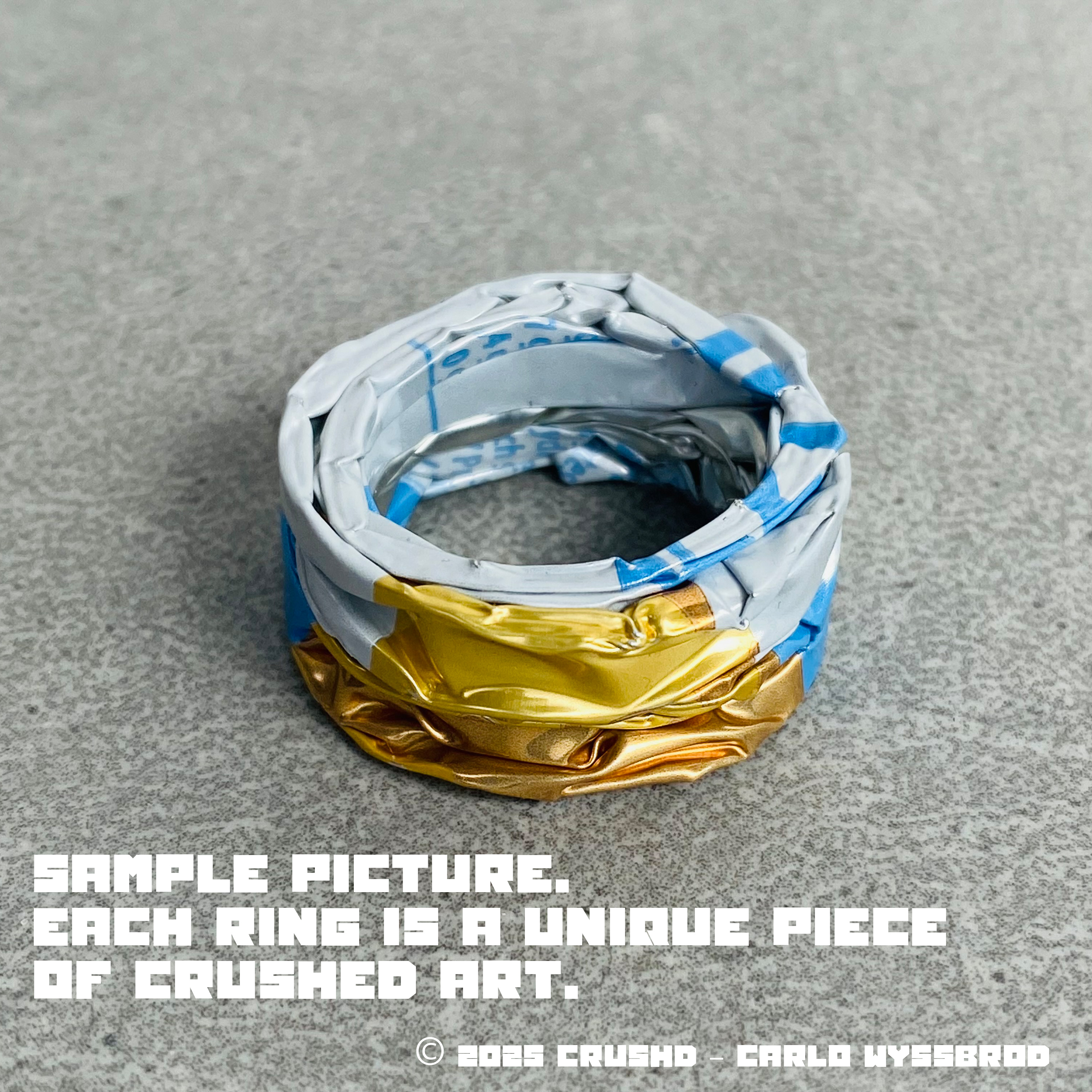 Each ring is pressed from raw, upcycled aluminum and left completely untouched — unpolished, unprocessed, and full of character. This preserves the authentic texture, unique imperfections, and vibrant identity of the original can.